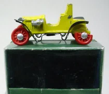 1904 DARRACQ. yellow with black chassis. red wheels. the steering column is broken off. otherwise very good. includes original AHI box - but it is for a different car. 12.00