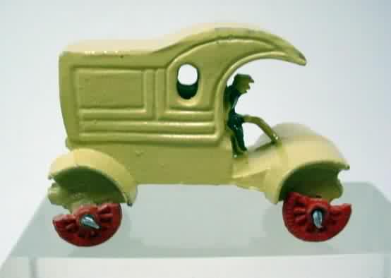 1904 OLDSMOBILE DELIVERY TRUCK. tan with green driver. red plastic wheels. a few flea bites. note that two wheels are broken. approx. HO scale. includes original box. 15.00