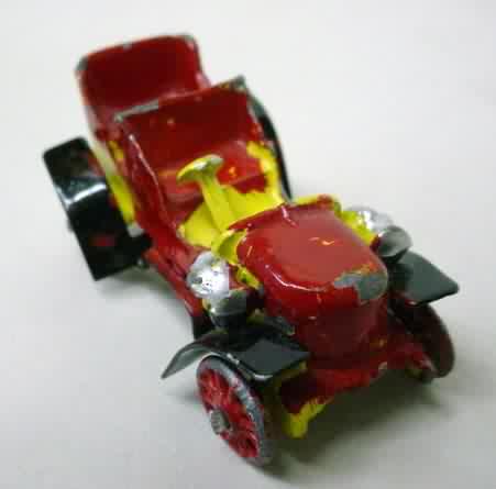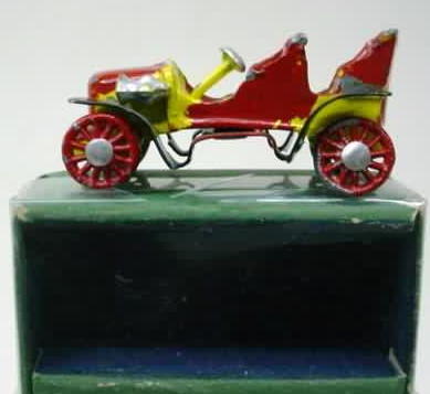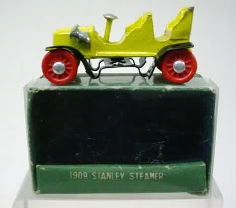 1909 STANLEY STEAMER. yellow with black chassis. red wheels. approx. HO scale. one of the wheels is broken otherwise excellent with box. 15.00