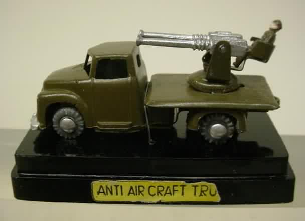 military ANTI-AIRCRAFT TRUCK. khaki green with gun mounted on rear with figure. label on box worn. mint in clear plastic display box. sorry sold