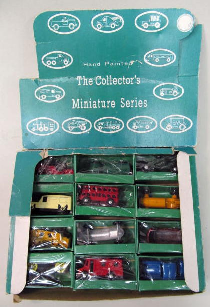 boxed set of 12. THE COLLECTOR'S MINIATURE SERIES. bottom of box says TM Japan. each vehicle is mint in it's own box (most are still factory sealed). includes: Dennis Fire Engine; steam roller; Army jeep with roof up; ambulance; double deck bus; white open wheel race car; yellow open wheel racer; red truck van; bus; black old time car with yellow wheels; futuristic blue car with large fins. master box is worn. scarce set. 225.00