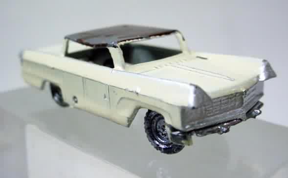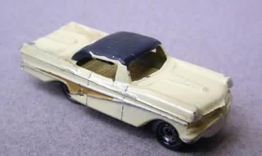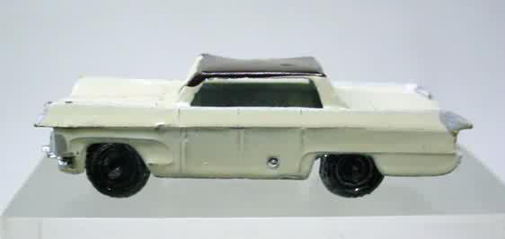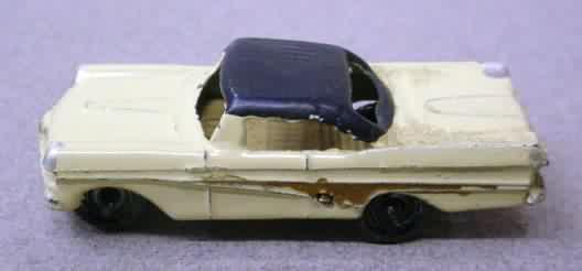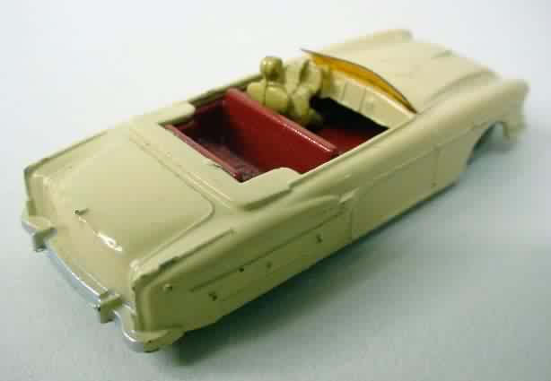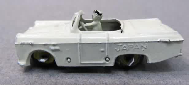 1950's AMERICAN CONVERTIBLE open with driver. cream. silver grille. black and yellow wheels. un painted metal base. "Japan" in raised lettering on rear quarter panel. excellent and scarce. 26.50