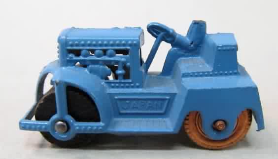 STEAM ROLLER. blue. rear wheels are brass color with black wood roller. paint is near mint. driver's head is broken off. hard to find piece. 20.00