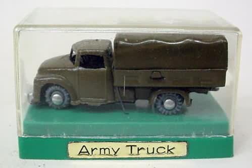 ARMY TRUCK. khaki green w/tin canopy with star decal. never played with. tied in box. gold foil label intact. Mint in plastic display box. 25.00