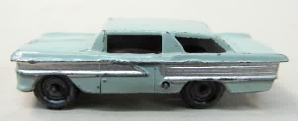 1950's AMERICAN CAR. 2 door hardtop. light light blue with gold insert and silver trim. unpainted base is marked "Japan". solid disc wheels. paint chips on passenger side. very good to excellent. 22.50