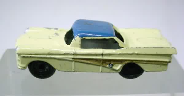 1950's AMERICAN CAR. 2 door hardtop. yellow with blue roof. gold trim on sides. unpainted base is marked "Japan". solid disc wheels. light wear. very good to excellent. 21.00