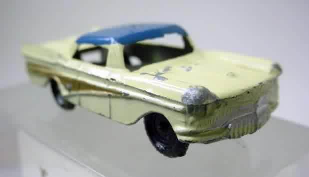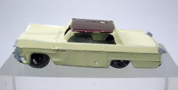 1950's AMERICAN CAR. 4 door hardtop. very pale yellow with brown roof. silver trim. unpainted base is marked "Japan". solid disc wheels. large paint chip on passenger side of roof. very good. 18.50