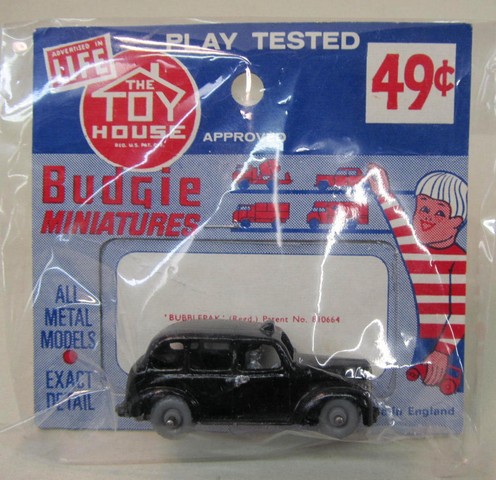 #13. AUSTIN TAXI CAB. black with silver base and interior. gray plastic wheels. near mint plus to mint with original American issue card back. (photographed inside plastic baggie). 40.00