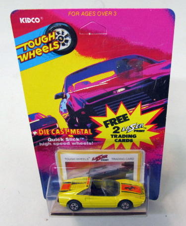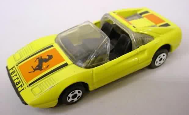 number unknown (80020). FERRARI 308 GTB. yellow with orange & black tampos. black interior. comes with 2 Laser Print Trading Cards. mint on factory sealed blister card. 17.50