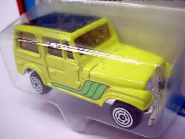 117-3. CJ-7 JEEP RENEGADE. bright yellow with black roof & black interior. green designs on sides. approximately 1:87 scale. older item. 1979 issue. never played with. Mint on factory sealed blister card. 17.00