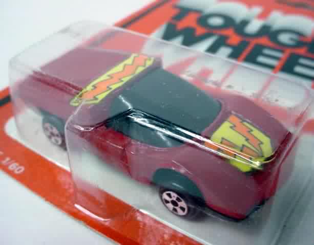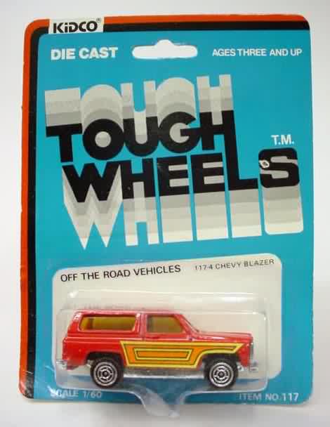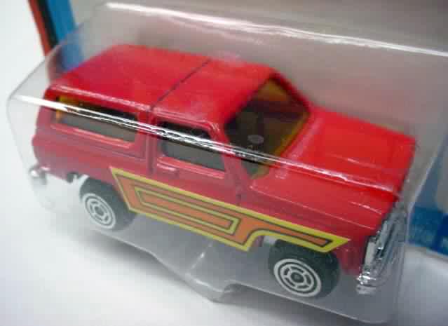 117-4. CHEVROLET BLAZER. red with black interior. orange and yellow side decorations. approximately 1:87 scale. older item. 1979 issue. never played with. Mint on factory sealed blister card. 16.50