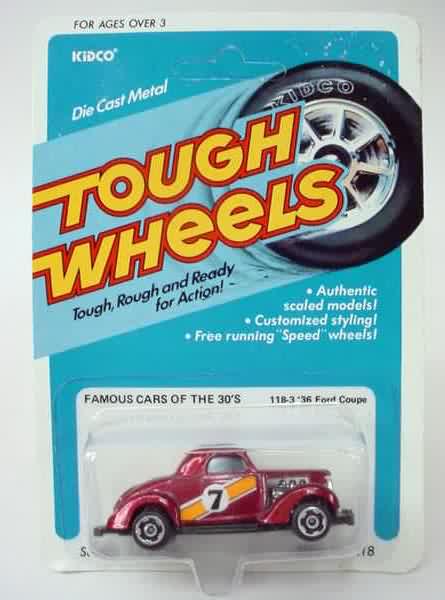 118-3. 1936 FORD COUPE. "Famous Cars of the 30's Series". Metallic maroonish purple with beige interior. approximately 1:87 scale. older item. 1980 issue. never played with. Mint on factory sealed blister card. 16.50