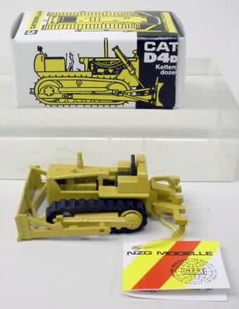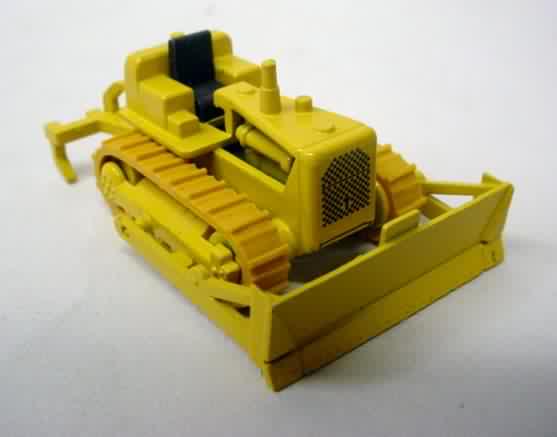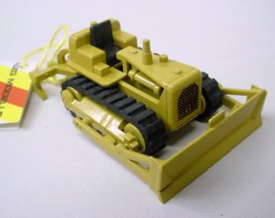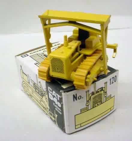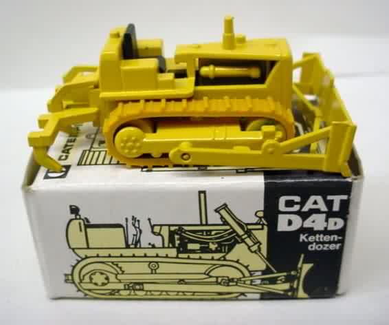 120. Caterpillar CAT D4D Bulldozer. dark yellow with black seat and dark yellow rubber treads. bulldozer blade lifts. has ripper fitted on rear. approx. 2.25" long. 1:87 scale. never played with. box shows some fading. mint in excellent box. 25.00
