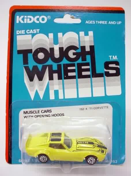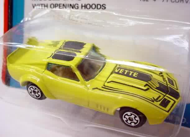 152-4. '71 CORVETTE. yellow with light tan interior. black tampo. approximately 1:87 scale. older item. 1980 issue. never played with. Mint on factory sealed blister card. 16.50