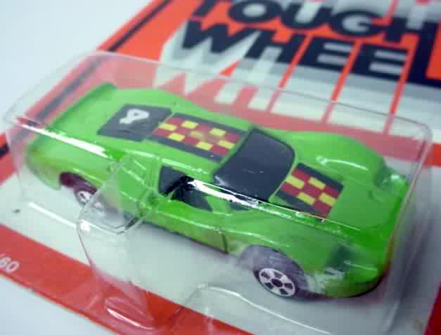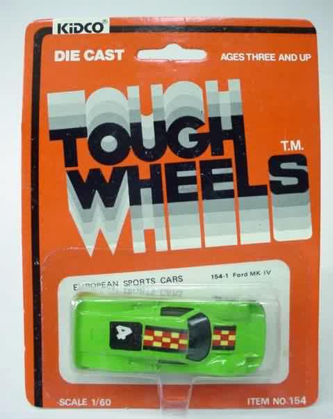 154-1. FORD MK IV. lime green with black interior. yellow/red/black label with racing #4, approximately 1:87 scale. older item. 1979 issue. never played with. Mint on factory sealed blister card. 15.00