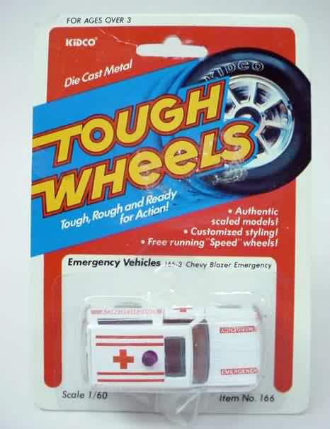 166-3. CHEVROLET BLAZER EMERGENCY AMBULANCE. white with brown interior. red tampos. blue dome light on roof. approximately 1:87 scale. older item. 1981 issue. never played with. Mint on factory sealed blister card. 16.50