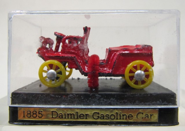 1885 DAIMLER GASOLINE CAR. red with yellow wheels. very similar to AHI but not sure if it was made by them. hard plastic display box base says T.M. Japan. approx. HO scale. paint is flaking off. no play wear. sorry sold