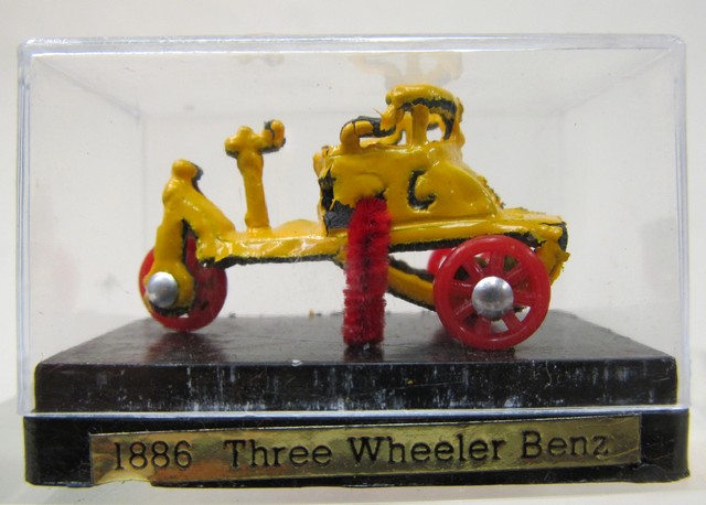 1896 THREE WHEELER BENZ. yellow with red wheels. very similar to AHI but not sure if it was made by them. hard plastic display box base says T.M. Japan. approx. HO scale. paint is flaking off. no play wear. sorry sold