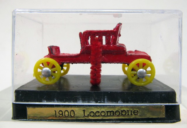 1900 LOCOMOBILE. red with yellow red wheels. very similar to AHI but not sure if it was made by them. hard plastic display box base says T.M. Japan. approx. HO scale. paint is flaking off. no play wear. sorry sold