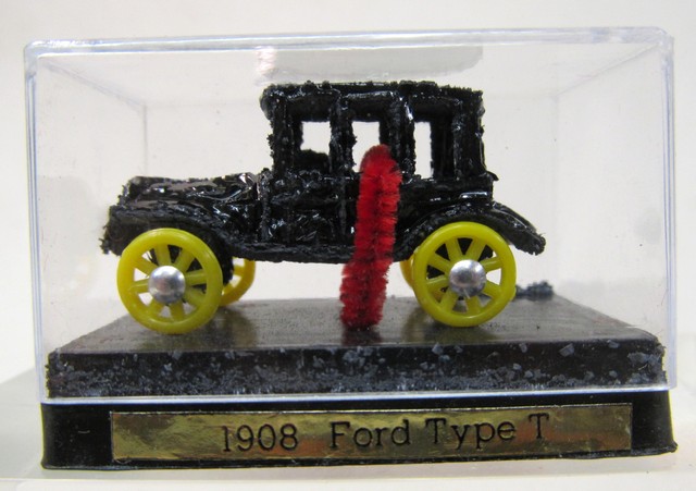 1908 FORD TYPE T. black with yellow wheels. very similar to AHI but not sure if it was made by them. hard plastic display box base says T.M. Japan. approx. HO scale. paint is flaking off. no play wear. 15.00