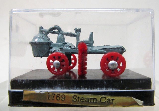 1769 STEAM CAR. gray with red wheels. very similar to AHI but not sure if it was made by them. hard plastic display box base says T.M. Japan. approx. HO scale. paint is flaking off. no play wear. sorry sold