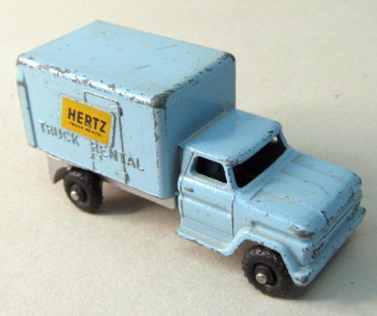 #56. HERTZ TRUCK RENTAL. pale blue. silvery base. black wheels. opening tail gate door. play wear. very good. sorry sold