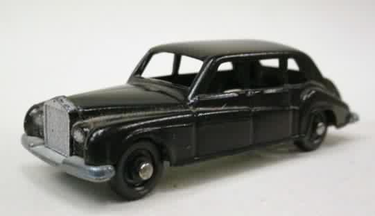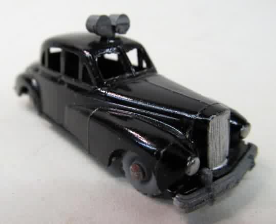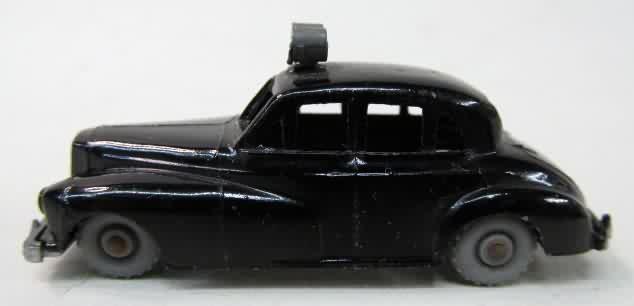 #5. WOLSLEY 680 POLICE CAR. black with silver base. gray plastic wheels. siren or spotlight mounted on roof. no play wear. near mint to mint. no box. 42.00