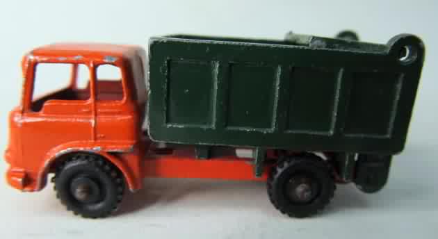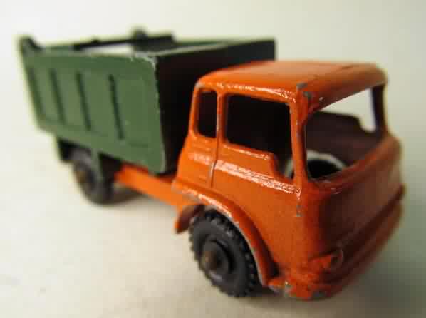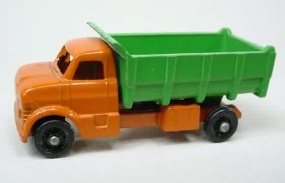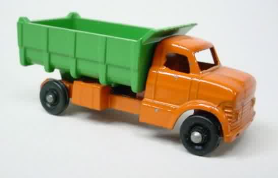 #21. BEDFORD TK TIPPER DUMP TRUCK. orange with green dump. black plastic wheels. light play wear to high ridges. excellent. 24.00