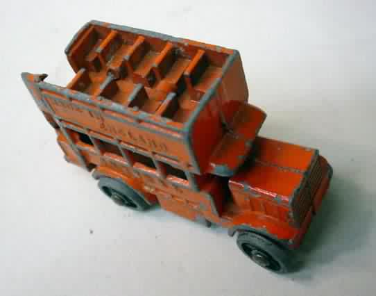 THE GENERAL open top double deck bus. orange with black spoked wheels. approx. 2.25" long. casting is perfect. paint worn. 12.50