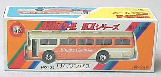 #102. HINO AIRPORT LIMOUSINE BUS. orange and cream. black interior. Comes with sticker sheet with logos. Opening Doors. Mint in window display box. 39.50