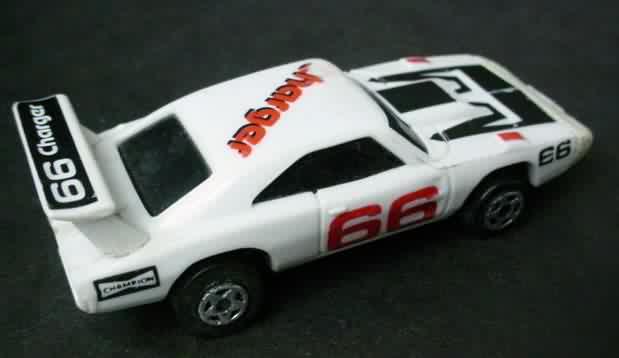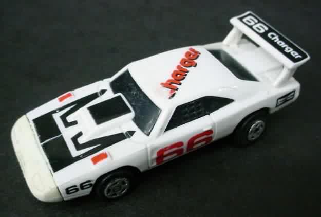 Kidco Burning Key 1966 DODGE CHARGE. white with black windows. red & black tampo. 1980's. Made in Macao. approx. 1:87 scale. light wear. excellent plus or nicer. 11.50