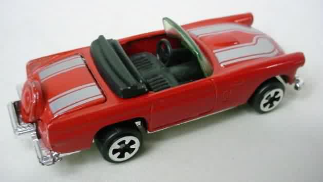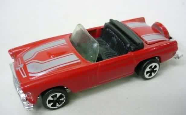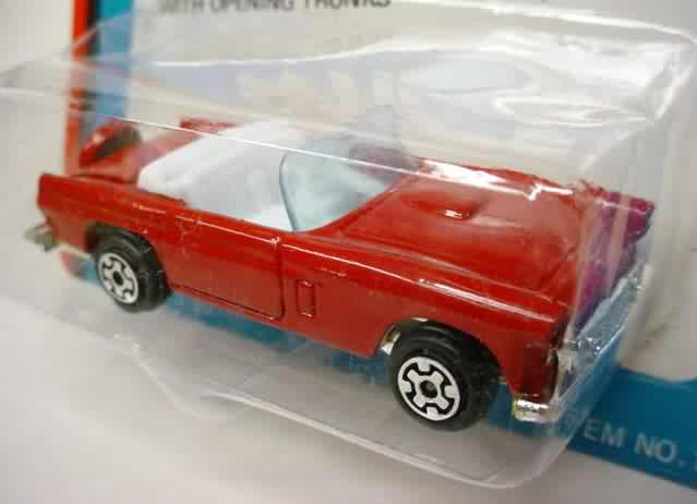 Kidco THUNDERBIRD CONVERTIBLE. red with black interior. silver tampo. Continental kit on rear. 1979. Made in Macao. polished chrome plated base. approx. 1:87 scale. no play wear. flea bite on top rim of spare tire. near mint or better. 10.00