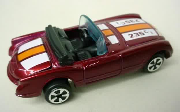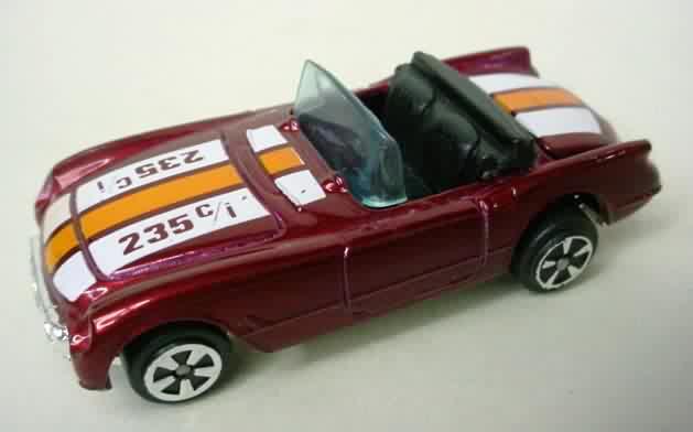 Kidco 1954 CHEVROLET CORVETTE Race Car. purplish mirror finish with black interior. white and orange stripes. 235 c.i. on hood. 1979. Made in Hong Kong. approx. 1:87 scale. no play wear. very minor rubs to hood stripes. near mint or better. 10.00