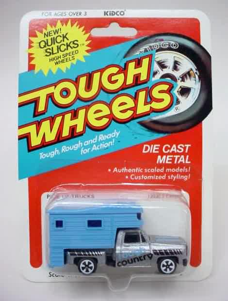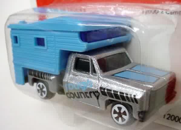 12000-2 CAMPER STEPSIDE PICKUP TRUCK. Metallic silver body with tinted windows. Blue camper. black and blue ROUGH COUNTRY tampos. approximately 1:87 scale. older item. 1981 issue. never played with. Mint on factory sealed blister card. 17.50
