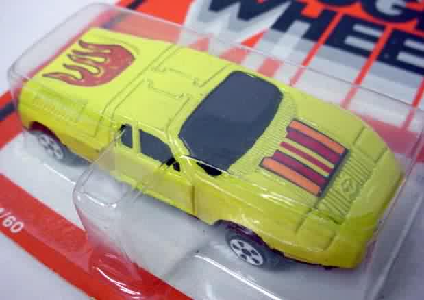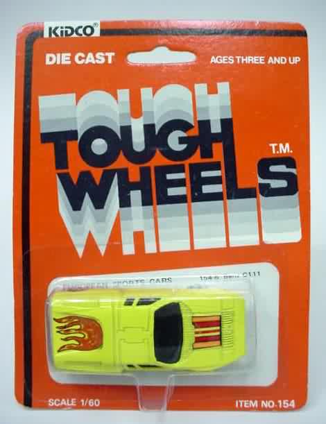 154-6. MERCEDES BENZ C111. yellow with black windows. red/orange flame tampos and stripes. approximately 1:87 scale. older item. 1979 issue. never played with. Mint on factory sealed card. 15.00