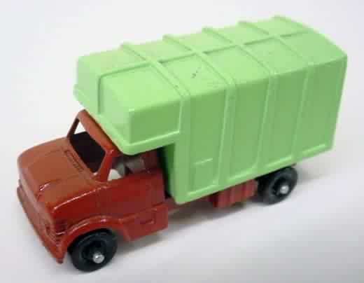618. WASTE DISPOSAL TRUCK. dark orange with green bin. no play wear. mint but no box. 22.00