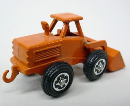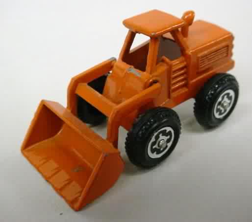 627. EARTH MOVER (front end bucket loader). orange. fancy wheels. tow hook on rear. excellent or nicer. 20.00
