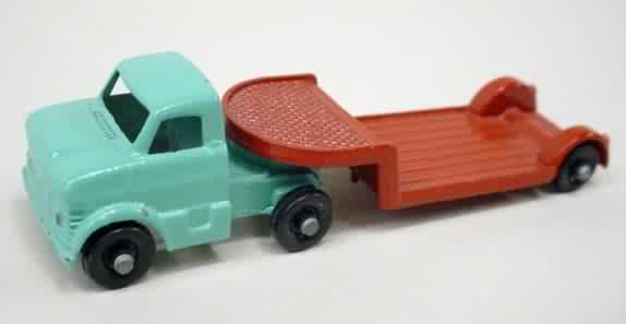 612. APACHE LOW LOADER TRUCK. turquoise blue cab with dark red low boy trailer. 2 piece. no play wear. near mint or better. 22.00