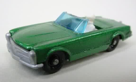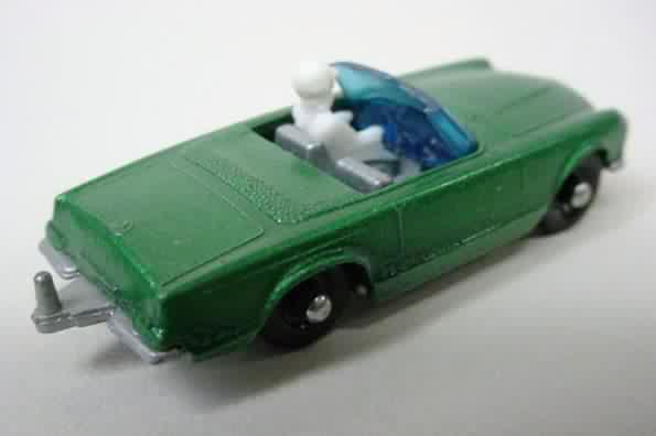 605. MERCEDES 280 SL open convertible. metallic green with silvery gray interior. white driver figure. blue tint windshield. tow hook on rear. no play wear. near mint to mint but no box. sorry sold