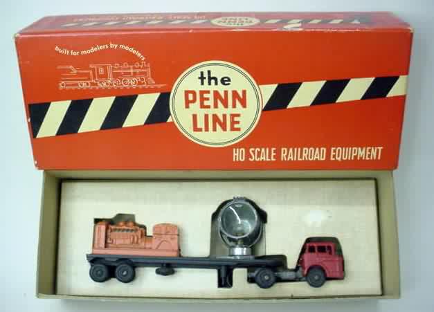 A4. FORD TILT CAB TRACTOR with FLOODLIGHT TRAILER. HO scale. late 1950's issue. this is the Factory Built-up version (was also available as a kit). red cab; black trailer; orange generator; gray searchlight. never played with. includes box insert. mint in excellent plus box. 49.00