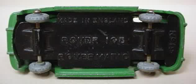 #19 ROVER 105 ROVERMATIC. Green. black baseplate. grey metal wheels. silver trim. There are some very fine rubs and faint scratches on the passenger side. overall; in excellent plus condition. A really nice example of this hard to find piece. 25.00