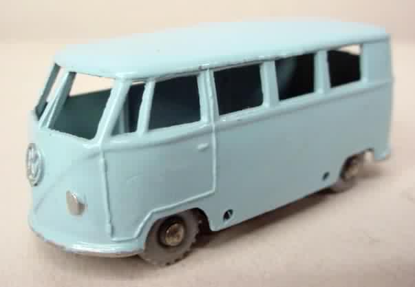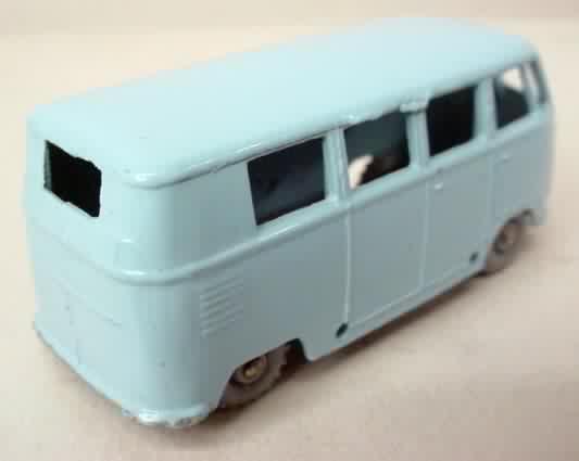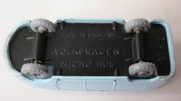 #12 VOLKSWAGEN MICRO BUS. circa 1957 issue. light blue with black base plate. gray plastic wheels. very minor box rubs to the silver trim paint on bumpers. never played with. C-9.9. near mint plus to mint. no box. 69.50