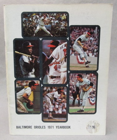 Yearbook. 1971 BALTIMORE ORIOLES. color cover photo collage. 68 pages plus the covers. tight and clean. price tag sticker residue in lower right corner. overall excellent plus or nicer. 30.00