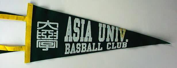pennant. ASIA UNIV. BASEBALL CLUB. White letters on soft green felt. orange border with yellow and green tassels. tip is intact. has some Oriental lettering. 1960's vintage. 23.5" long. Has light coffee stain on the letter "V" - should clean. otherwise mint. unusual pennant! 35.00