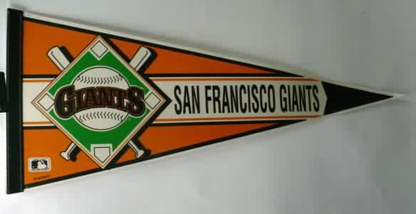 pennant. SAN FRANCISCO GIANTS. black, orange, green, white. black border. 1990's, made by Wincraft. minor pinholes. tip is intact. Colorful baseball diamond logo. 29.5" long. Near mint. 15.00