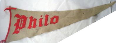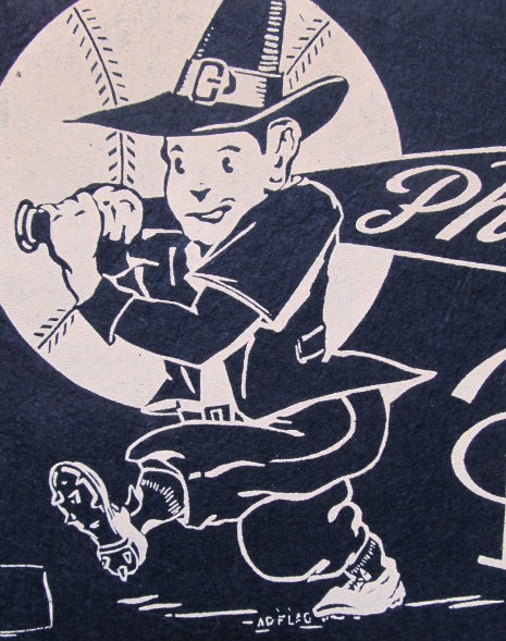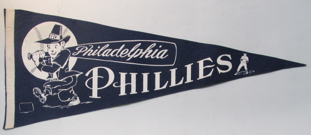 pennant. PHILADELPHIA PHILLIES. white on dark dark soft blue. white border. tip intact. has large Pilgrim / Quaker mascot logo. standard size approx. 29.5" long. near mint plus. 120.00