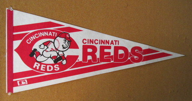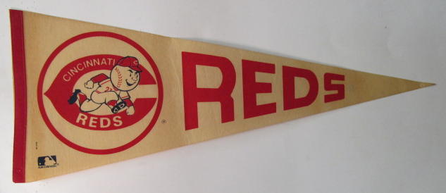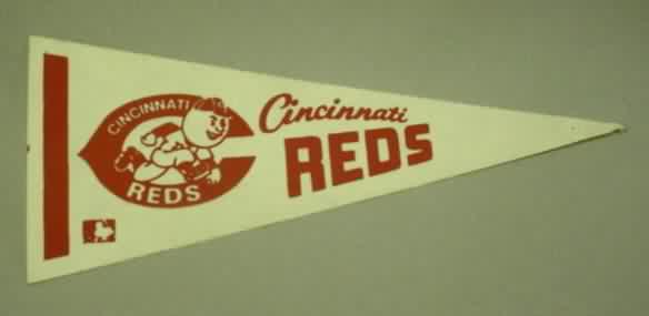 pennant. CINCINNATI REDS. red on white. red border. large team logo. has the MLB rectangular logo. tip intact. 1970's vintage. approx. 30" long. near mint. 20.00