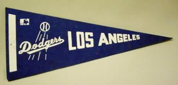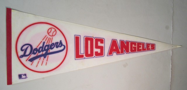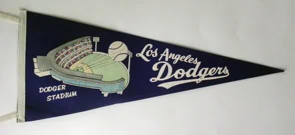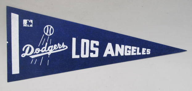 pennant. LOS ANGELES DODGERS. white on dark blue. has the MLB logo. point intact. stiffer felt material. 1970's vintage. smaller size approx. 12" long. tiny tack holes. colors bright and strong. excellent to near mint. 10.00