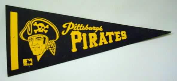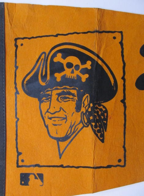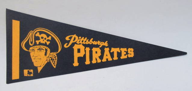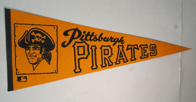 pennant. PITTSBURGH PIRATES. black on dark orange. black border. tip intact. 1970's. approx. 30" long. pinholes in corners. excellent. 19.50