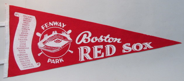 pennant. 1957 BOSTON RED SOX Fenway Park. white on red soft pennant. white border with matching tassels. tip intact. has scroll listing the 1957 team roster: Williams; Piersall; Brewer; Daley; Mauch; Delock; Vernon; et al. graphics of the stadium. standard size approx. 29.5" long. colors are bright and strong. very minor nibbling along top border otherwise near mint. 150.00